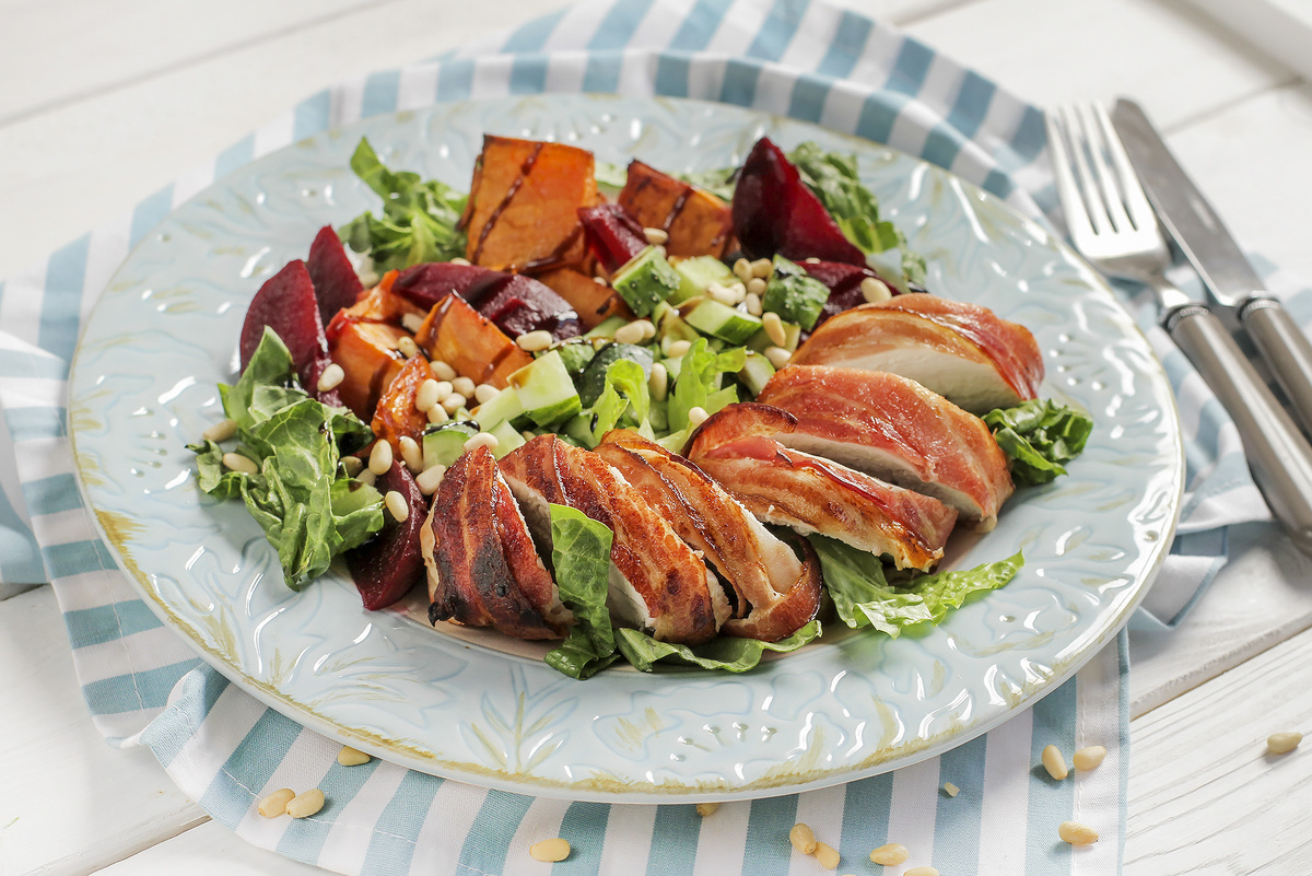 Шаг 1: Духовку разогреть до 180°C. Филе индейки следует посолить и поперчить, а затем обернуть беконом. Запекать в течение 10 минут. Очистить и нарезать батат средними кубиками, затем добавить его к индейке и запекать еще 10 минут. Не забудьте немного остудить индейку, чтобы листья салата не завяли. Нарежьте филе на ломтики.