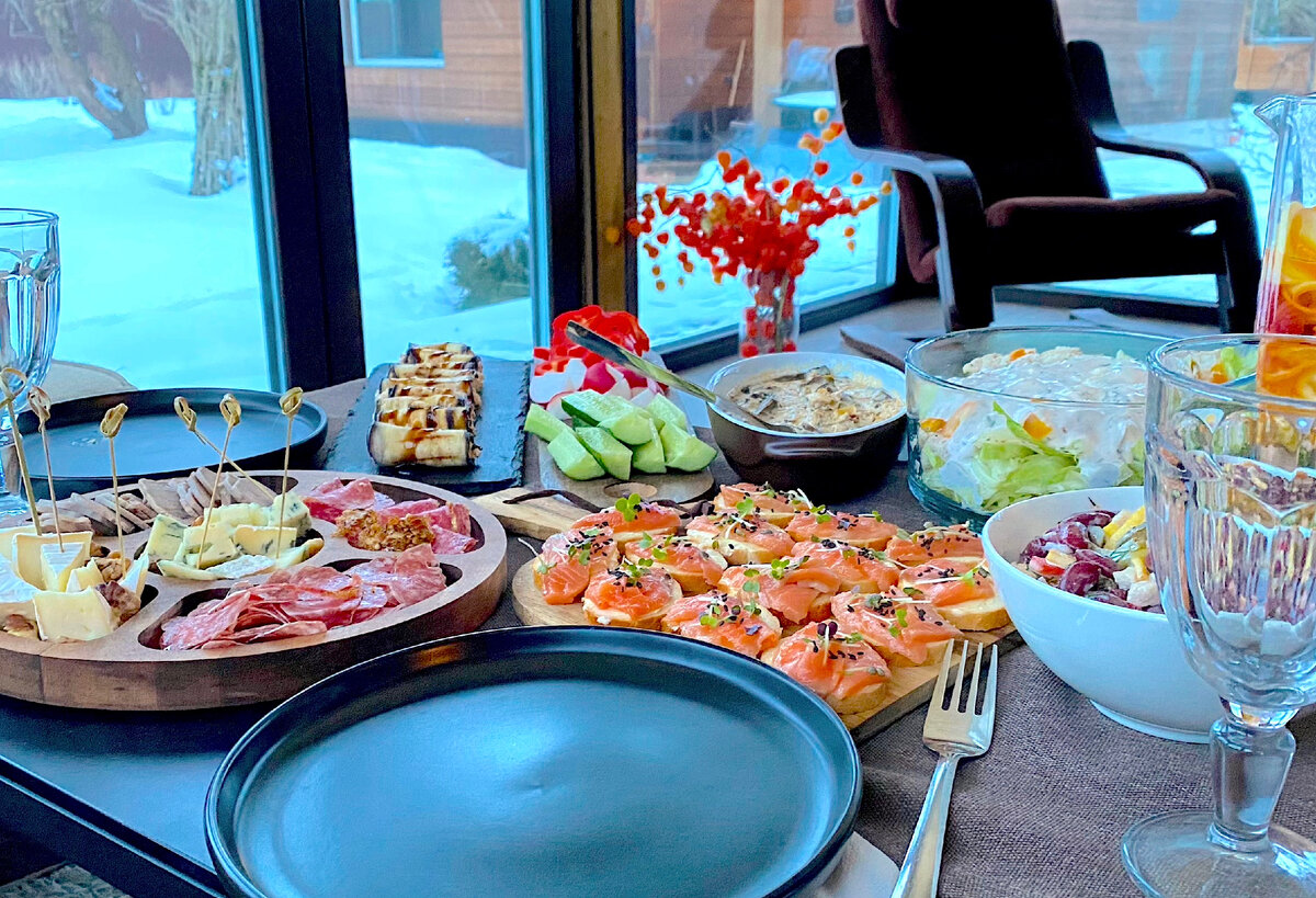 В меню встречи нашлось место салатам и тарелкам на скорую руку: овощной салат с айсбергом, помидоры черри, огурец и пармезан, заправленный сметаной с чесноком и зеленью; салат с фасолью и куриным филе, болгарским перцем и яйцами; рулетики с начинкой из брынзы, копченой курицы и грецких орехов — примеры того, как familiar блюда могут звучать и выглядеть празднично.