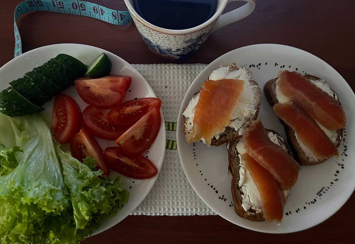 На завтрак были приготовлены аппетитные бутерброды со слабосоленой форелью и творожным сыром. Овощи, разумеется, тоже нашли свое место на столе. Черный хлеб даже в небольшом количестве оказался в идеальной компании – всего один хвостик, отрезанный на три тонких ломтика, стал основой для трех замечательных бутербродов. Добавив к ним немного творожного сыра и ломтики форели, завтрак оказался не только вкусным, но и достаточно легким.