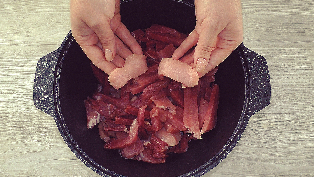 1. Нарезать мясо на кусочки или полоски, как больше нравится. Чтобы избежать лишней влаги, его стоит обсушить бумажным полотенцем.
