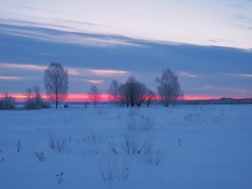 В этом году празднование Масленицы решено было провести в родном Дунилове, где ранее такой опыт не был получен. Ночь перед праздником выдалась ясной, и было надеждой насладиться великолепием зимнего восхода. Дорога к деревне была отмечена яркими красками, особенно во время проезда мимо Успенского монастыря, где палитра неба достигла своего пика.