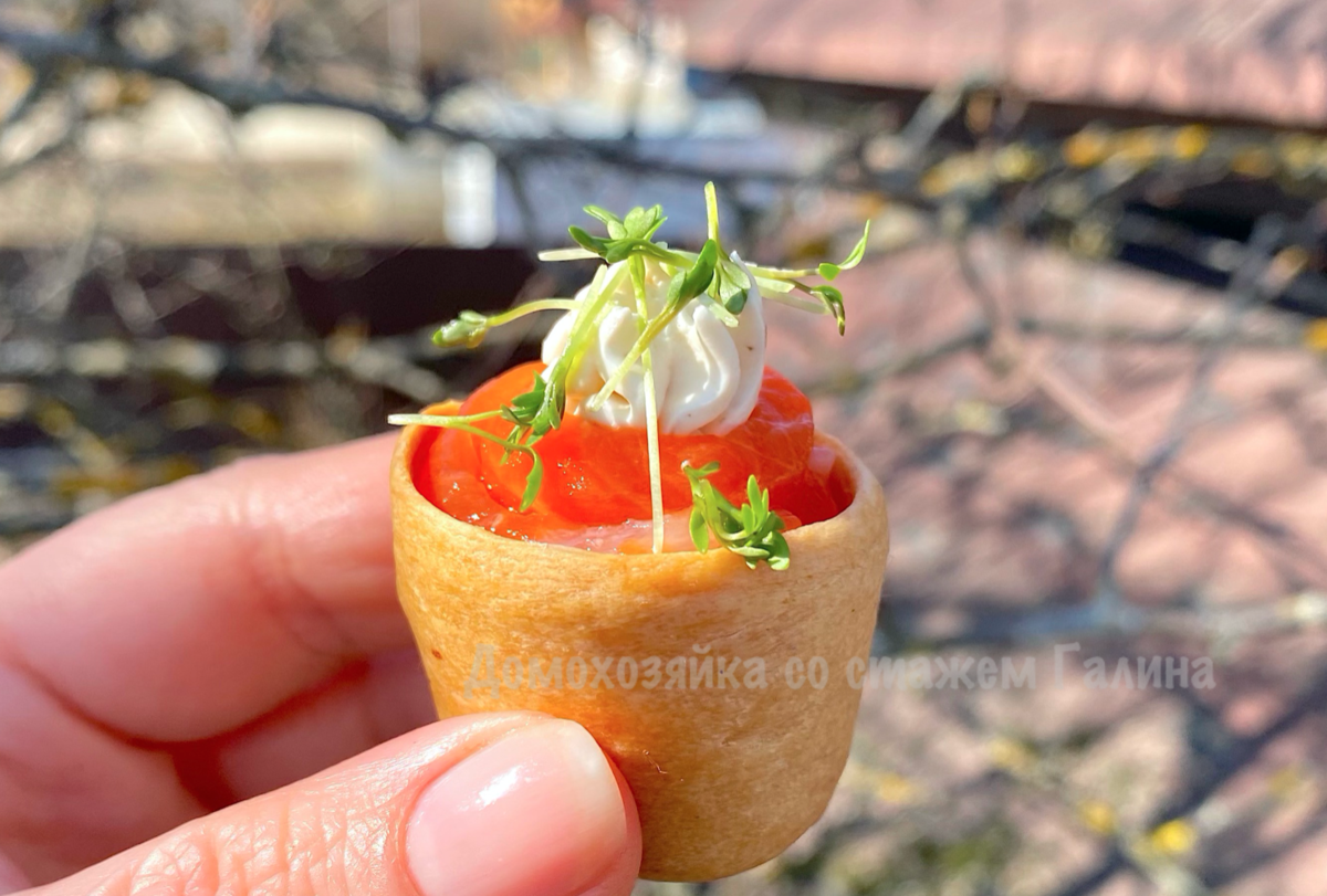 Когда тарталетки приятно зарумянятся, их нужно аккуратно извлечь из рюмок. Благодаря достаточному количеству масла в тесте, они легко отделятся. После этого тарталетки можно начинить по своему вкусу. Прекрасным вариантом будет сочетание с красной рыбой, творожным сыром и кресс-салатом.