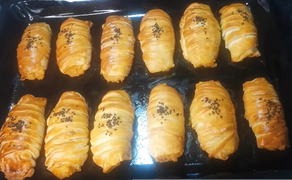 Приготовьте тесто, разделите его на небольшие колобки. Каждую часть раскатайте в тонкий пласт и разрежьте на треугольники. На каждый треугольник положите ложку начинки, сформируйте пирожок, создавая складки, как у гофрированного материала. Перенесите изделия на противень, смажьте взбитым желтком и, если хотите, присыпьте черным кунжутом для дополнительного вкуса и красоты.