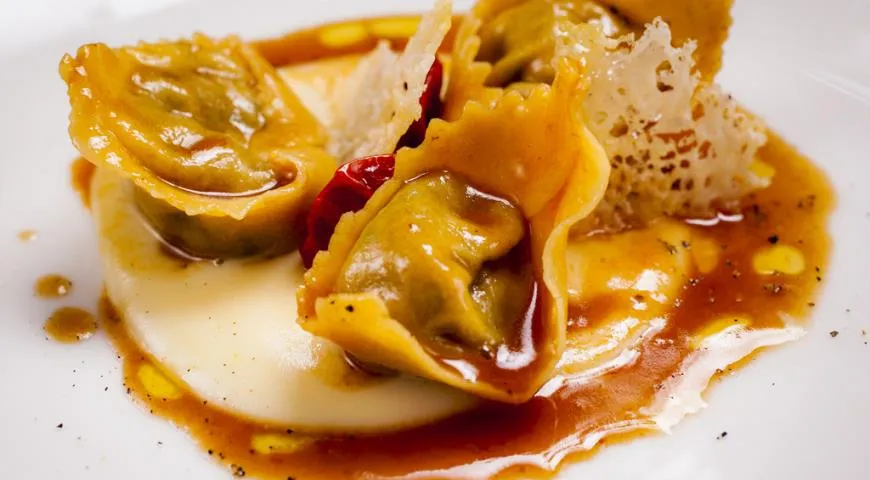 Равиоли с крабом и манго в цитрусовом соусе — это не просто старое знакомое блюдо, а настоящее гастрономическое произведение искусства. Здесь сладость тропических манго прекрасно гармонирует с насыщенным вкусом крабового мяса, а цитрусовые ноты наполняют блюдо свежестью. Это сочетание делает равиоли идеальным выбором для важных ужинов и особых случаев.