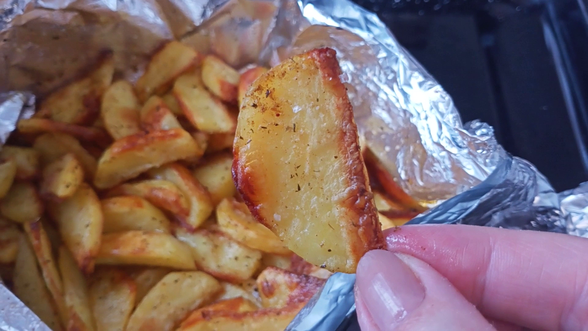 На противень, застеленный фольгой, выложите дольки картофеля и полейте их растительным маслом. Посыпьте приправой и перцем. Перемешайте, чтобы каждая долька была приправлена, и распределите их в один слой. Запекайте в духовке на верхнем уровне около 20 минут.