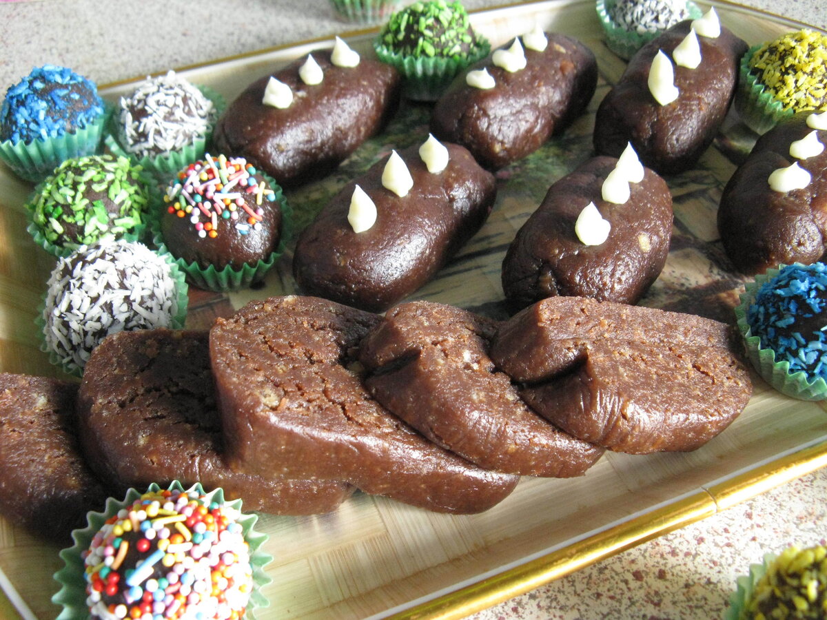 С этой основой можно создать и другие восхитительные десерты. Например, «Картошка» — формируя небольшие шарики по 60-100 граммов и складывая их в холодильник, можно создать мини-колбаски. Для этого потребуется немного масла и сгущёнки для крема, что добавляет оригинальности готовым пирожным.