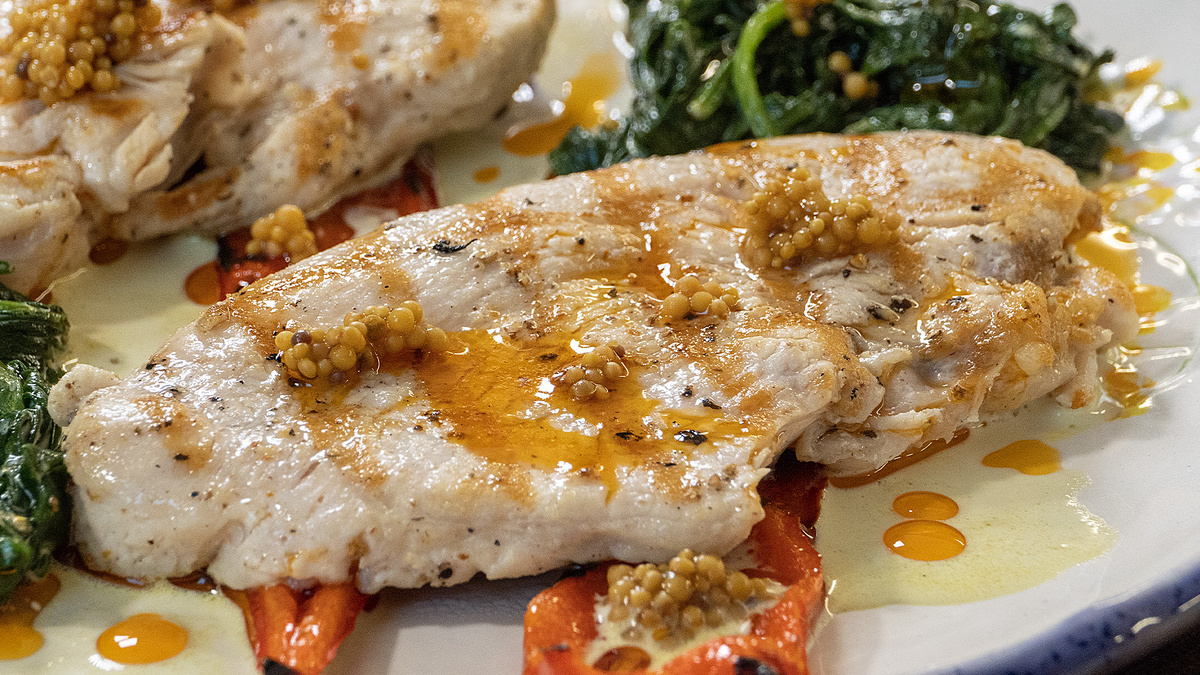 Продовжите обжаривать эскалопы до готовности и подавайте горячими вместе со шпинатом и перцем. Украсьте ваш шедевр зернами дижонской горчицы и сбрызните томатным маслом. Это блюдо обязательно станет фаворитом на вашем столе! Приятного аппетита!