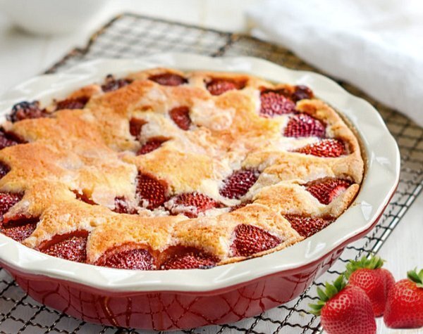 Готовый торт можно подавать как горячим, так и остывшим. Он прекрасно сочетается со взбитыми сливками или мороженым, подчеркивая вкусовые ноты клубники.