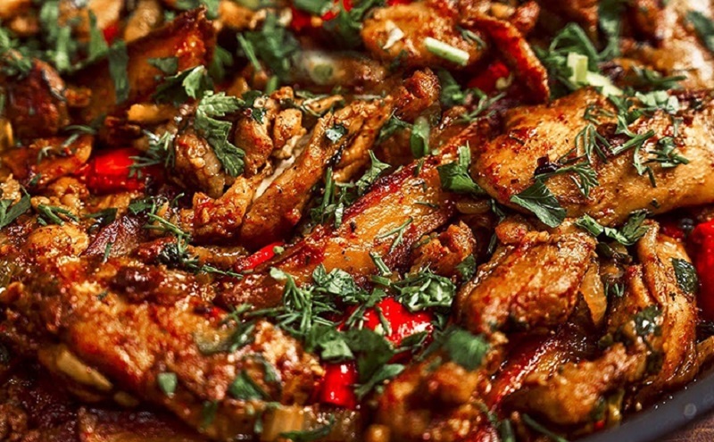 Пока курица маринуется, картофель нарезается дольками и обжаривается до появления золотистой корочки. Так же обжариваются и овощи: лук, сладкий перец и чеснок добавляются на сковороду, где уже жарится курица и картофель. За считанные минуты готовое блюдо станет аппетитным и питательным.