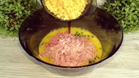 Теперь яйца разбиваются в миску, добавляется немного соли, и все взбивается до однородной массы. Количество соли можно регулировать, учитывая соль в сыре и колбасе. К полученной яичной смеси добавляются сыр, колбаса и лук. По желанию можно добавить любимые специи для подчеркнутого аромата.