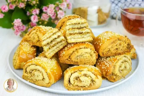 Смазать рулеты взбитым желтком и посыпать кунжутом. Выпекать при температуре 190 градусов около 25 минут до золотистого цвета. Переложить остывшие печенья на решетку для полного остывания и насладиться великолепным вкусом!