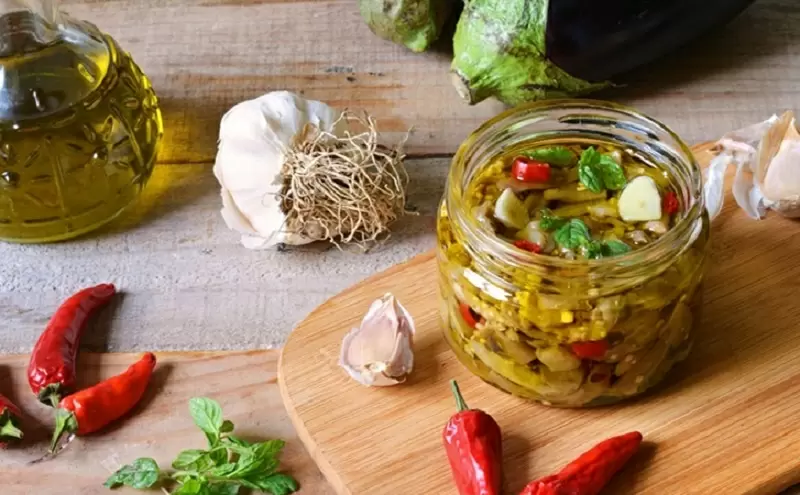 Баклажаны выкладывают в чистые банки, чередуя их со слоями специй, и полностью заливают оливковым маслом, добавляя в каждую банку по зубчику чеснока и кусочку острого перца. Перемешивание специй с овощами придаст блюду дополнительную изюминку.