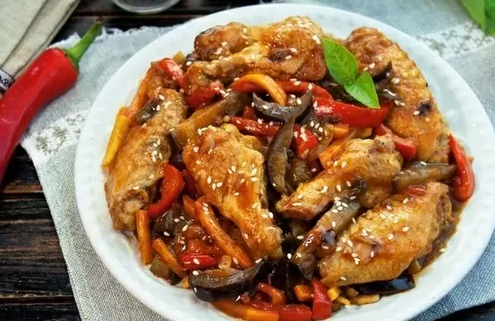 Затем все солится по вкусу и оставляется готовиться без крышки ещё на 5 минут. Блюдо подается горячим, украшается кунжутом и свежими зелеными базиликовыми веточками. Таким образом, куриные крылышки с овощами в кисло-сладком соусе становятся настоящим кулинарным шедевром, который не оставит равнодушными ни одного гостя.