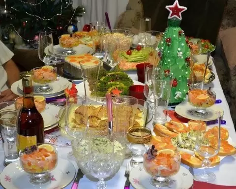 Традиционные закуски, такие как салат «селёдка под шубой» и знаменитый холодец, также пользовались популярностью. Холодец готовился с особым вниманием, требуя долгого варки для достижения идеальной консистенции. Также на столах часто можно было увидеть вкусные бутерброды с красной рыбой, шпротами и сыром.