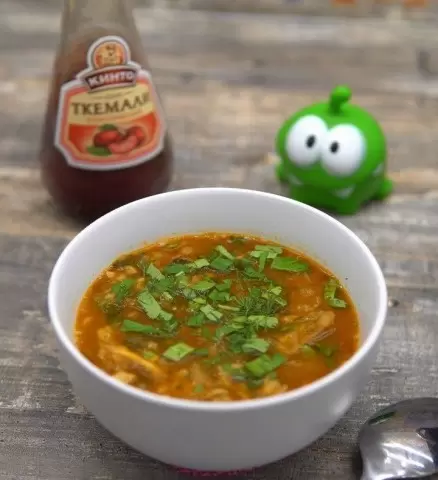 В это время в суп всыпают 80–100 г предварительно промытого риса и варят до готовности. Попутно добавляются мелко нарезанные зелень (кинза, петрушка, укроп по 10 г), 3–4 зубчика чеснока и целый чили, придающий лёгкую пикантность. Завершает процесс 100 г соуса ткемали, который придаёт особую кислинку и насыщенность. После приготовления суп подают горячим, посыпанным свежей зеленью, с лепёшками или хлебом.