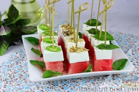 - Канапе из арбуза с фетой: Эта визуально привлекательная закуска, сочетает в себе сладость арбуза и солоноватый вкус феты, создавая идеальный баланс. Добавьте кольца острого перца и травы, чтобы подчеркнуть вкус.