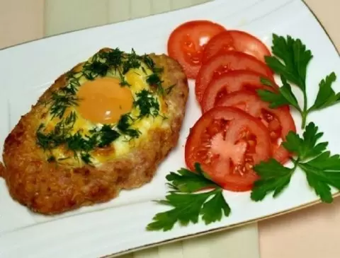 Далее необходимо тщательно перемешать фарш и разделить его на равные порции. Обычно получается 7-9 крупных котлет. Формируем их в виде лодочек, выкладываем на противень с небольшим расстоянием между ними. В каждой котлете аккуратно делаем углубление с помощью стакана или половника и разбиваем в него одно яйцо, оставляя желток целым.