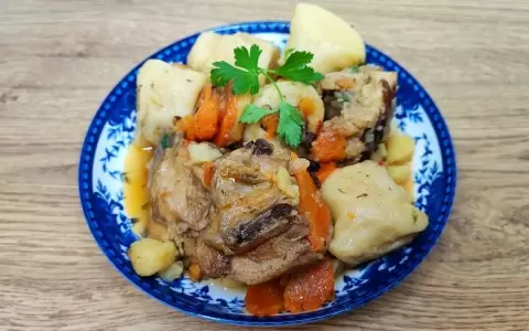 Когда мясо будет готово, добавьте в казан томатную пасту, затем лук и морковь. Обжаривайте смесь на среднем огне, постоянно помешивая, около 1-1,5 минут. После этого добавьте картофель, соль и специи. Влейте воду, закройте крышкой и тушите до готовности, не перемешивая.