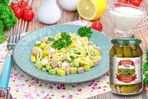 Когда продукты остынут, картофель очищают и нарезают мелким кубиком, вместе с ветчиной. Все ингредиенты выкладываются в удобную посуду. Свежий и маринованный огурцы нарезаются аналогично. Яйца очищают от скорлупы и отделяют белки от желтков. Белки мелко нарубаются и добавляются к основным ингредиентам.