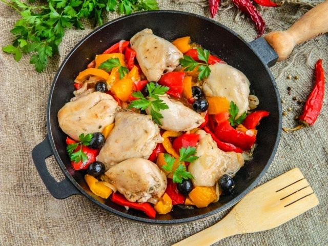 Далее, на том же масле обжарьте нарезанный полукольцами лук до мягкости, затем добавьте порезанный болгарский перец и курицу. Все перемешайте и тушите в течение нескольких минут.