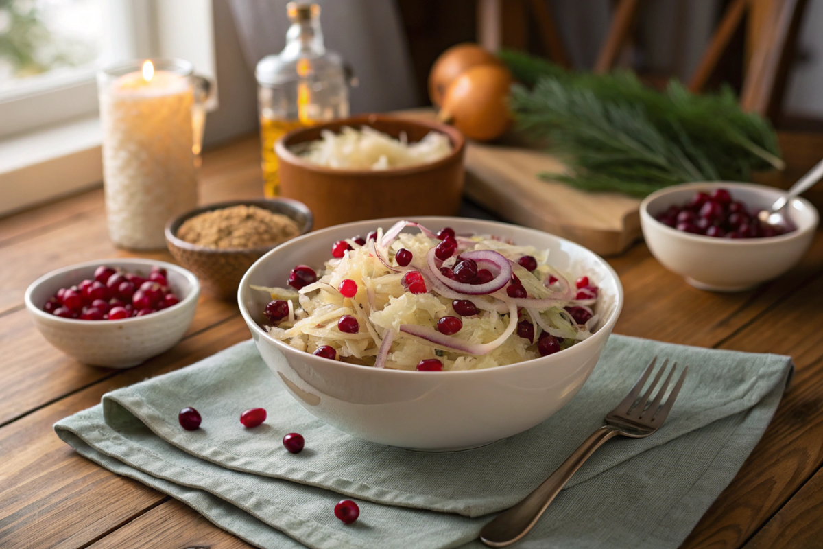 Квашеная капуста — это мощный источник витамина C и пробиотиков, которые поддерживают здоровье кишечника, а значит, и иммунной системы. В сочетании с клюквой, богатой антиоксидантами, этот салат становится настоящим оружием против болезней.