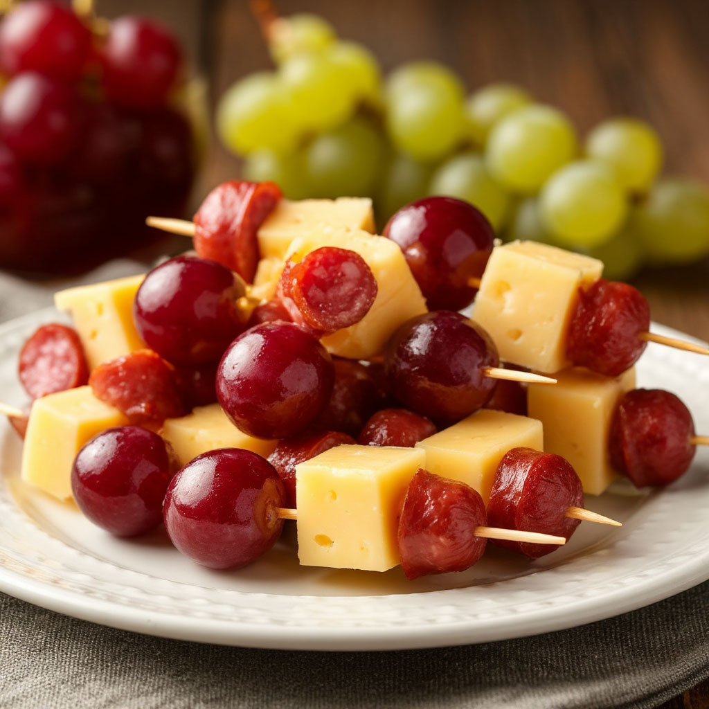 - Шашлычки на шпажках с сыром и виноградом: вкусное сочетание твердого сыра, сочного винограда и колбаски, которое легко собрать и удобно угощать.