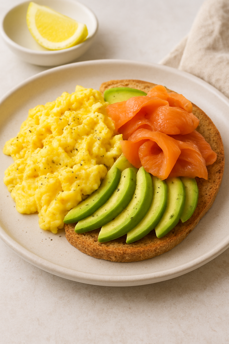 рецепт: скрембл с авокадо и лососем