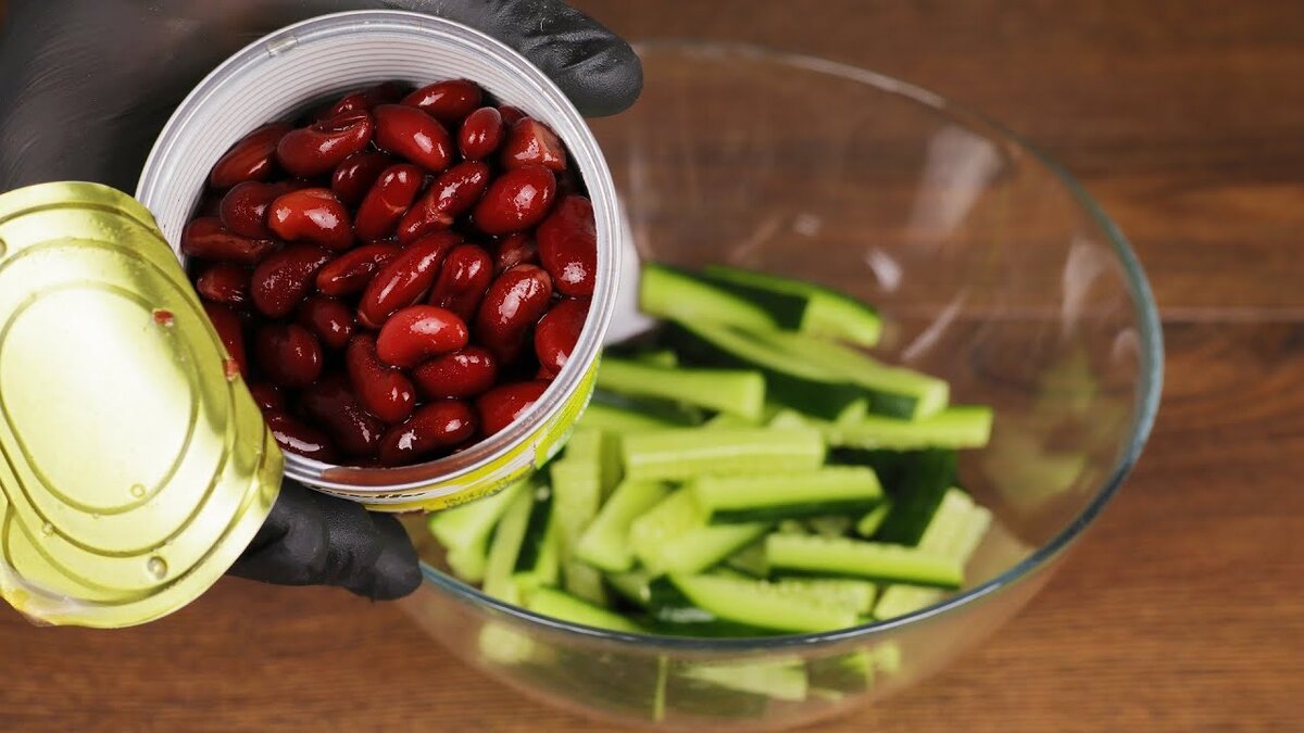 Теперь можно приступить к дому остальных ингредиентов. Огурец нарезается длинными брусочками и помещается в большую миску. Остывшую курицу тоже нарезаем и отправляем в контейнер с огурцами. Сморите жидкость из банки с фасолью и добавьте саму фасоль вместе с корейской морковью. Посолите и поперчите по вкусу, затем заправьте всё майонезом.