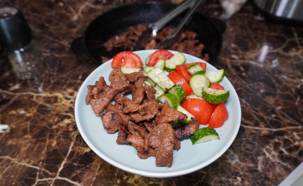 - 500 г мякоти говядины, нарезанной тонкими ломтиками