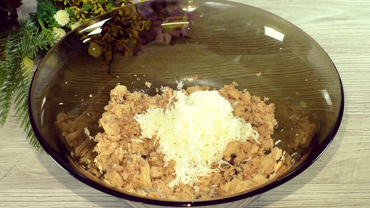 1. Начните с приготовления рыбы: слейте с горбуши жидкость и разделите её вилкой на мелкие кусочки. Если вы предпочитаете другие консервы, смело используйте их.
