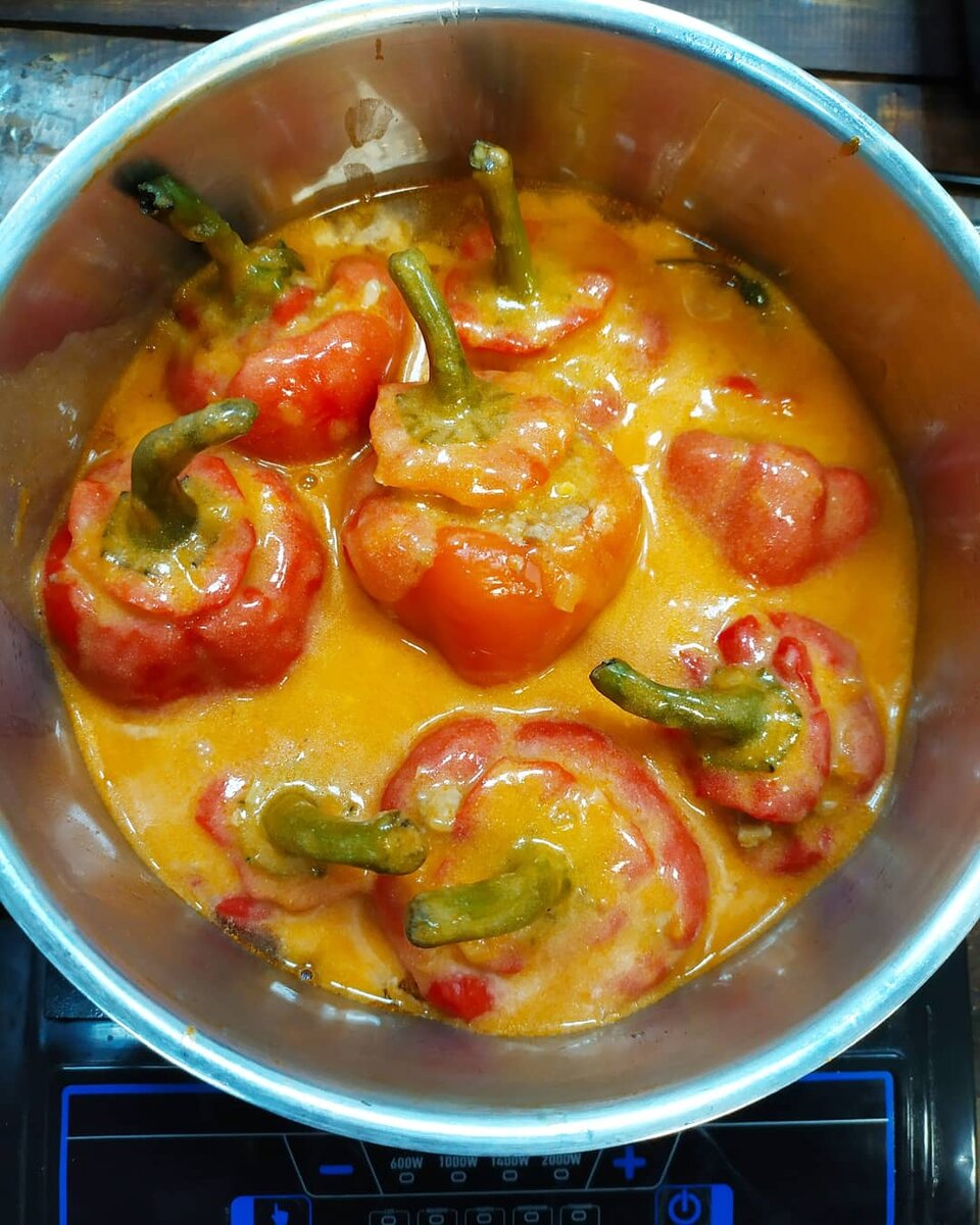 На фото представлена версия перцев в белом постном соусе с добавлением куркумы, что придает им особый цвет и аромат.
