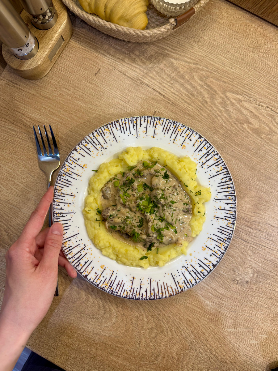И вот, невероятно сочный и ароматный бефстроганов готов! Он станет центральным блюдом вашего вечера и обязательно покорит сердца всех собравшихся за столом.