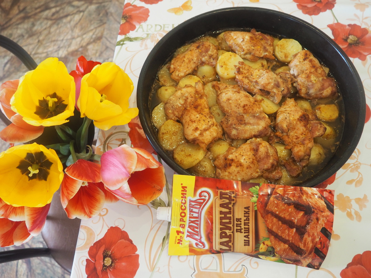Блюдо получилось невероятно вкусным, сочным и ароматным! Чтобы приготовить его, сначала было взято килограмм филе куриных бедрышек и замариновано с 100 г готового маринада «МахеевЪ» на 30 минут.
