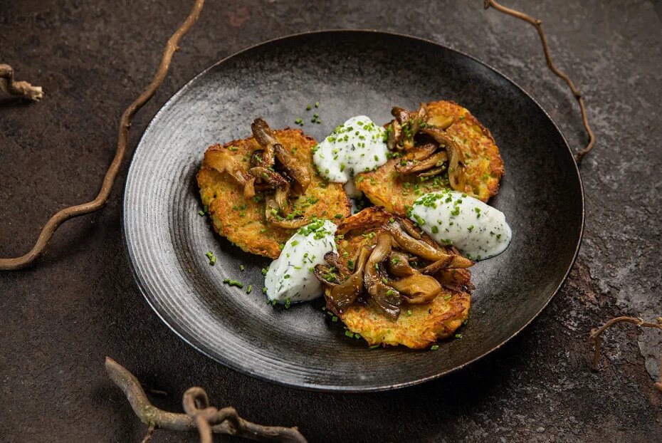 На блюдо выложите оладьи из картошки, сверху щедро добавьте обжаренные вешенки с зеленью. Завершите сервировку ложкой веганской сметаны и нарезанного лука-сибулета для дополнительного вкуса и аромата.