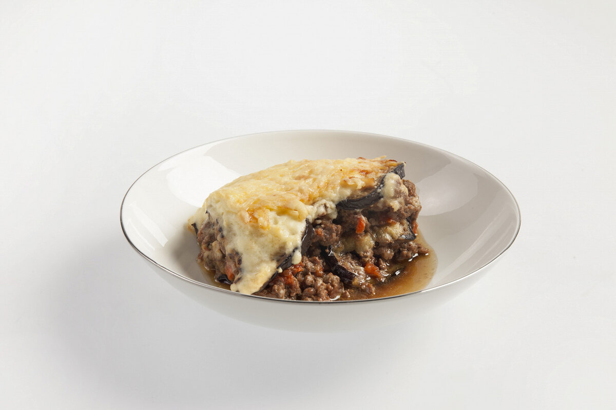 В форму для запекания выложить одну треть баклажанов, покрыть половиной мясного соуса, снова уложить баклажаны, затем фарш, и завершить оставшимися баклажанами. Полить соусом и обсыпать тертым сыром. Запекать в разогретой до 180°С духовке 45 минут. Перед подачей дать постоять 15 минут.