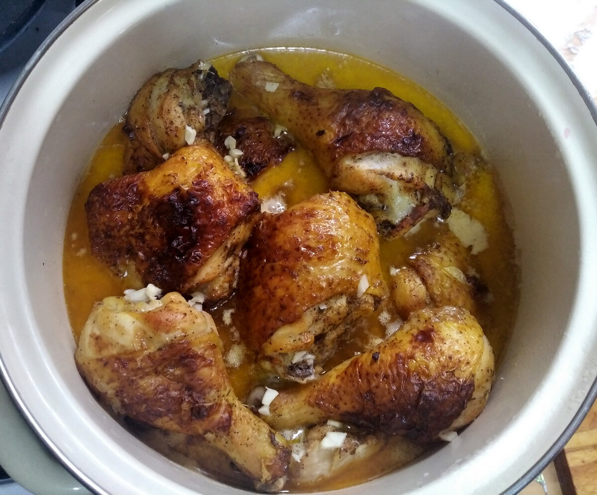 После этого аккуратно перекладываем окорочка в кастрюлю, добавляем оставшуюся заливку и тушим на маленьком огне около 10 минут. В конце добавляем мелко нарезанный чеснок и выключаем огонь, накрываем крышкой, чтобы ароматы смешались.
