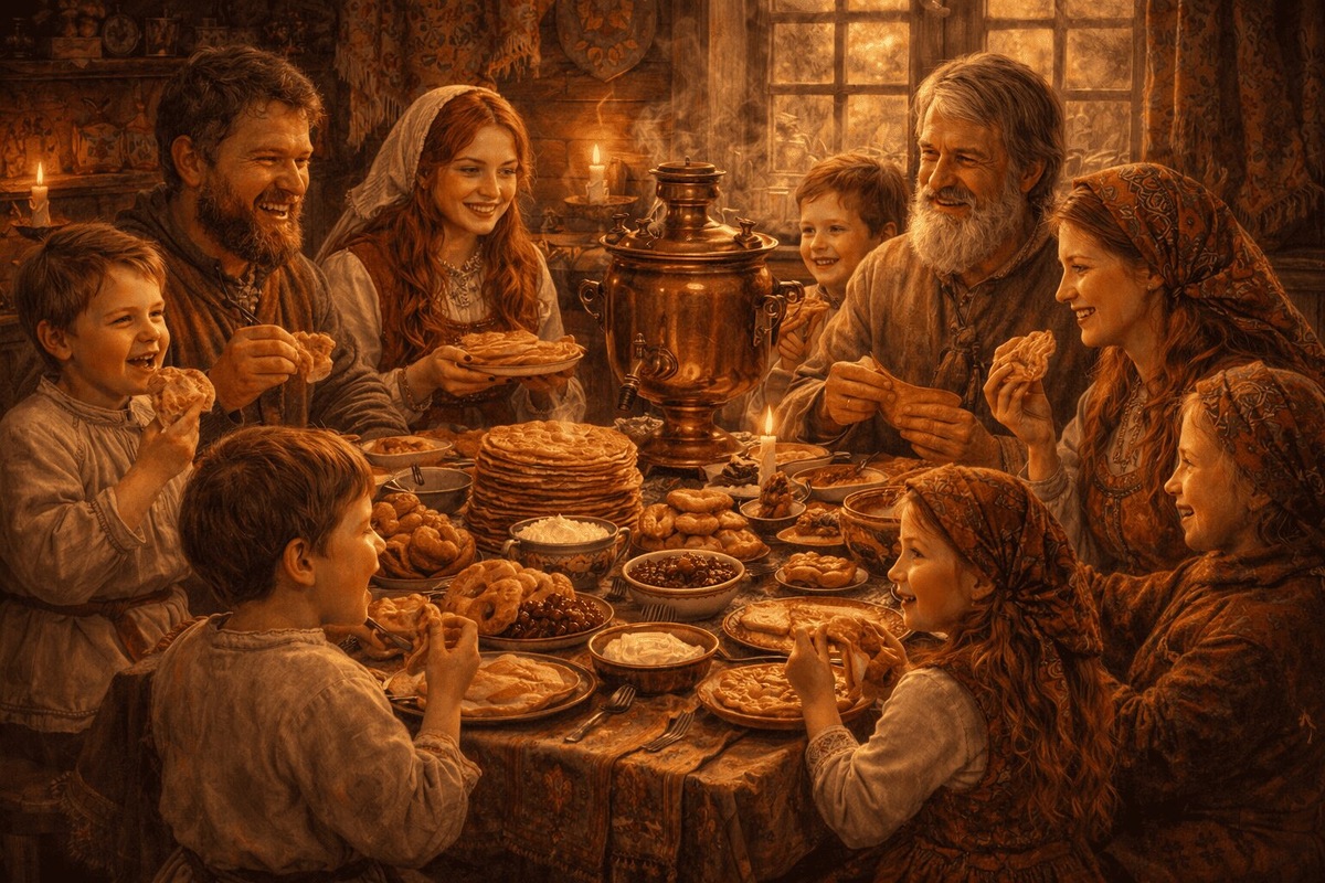 На Масленицу все собираются за общим столом, чтобы насладиться вкусом традиционных угощений и радостью общения. В этот праздничный период принято посещать родных и друзей, обмениваться подарками и особенно радовать детей блинами и ароматными рыбатскими пирогами. Особое внимание уделяется чаю — самовар всегда занимает почетное место на столе, а блины щедро подаются с разнообразными начинками: вареньем, творогом, сыром и фруктами. Мясные блюда в эти дни исключаются, поскольку приближается Великий пост.