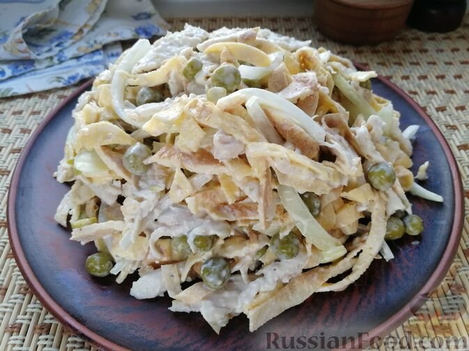 - Салат с курицей, зелёным горошком и яичными блинчиками. Нежное куриное филе в сочетании с маринованным луком и хрустящими блинчиками создаёт гармонию вкуса и текстур. Этот салат станет отличным выбором для сытного перекуса.