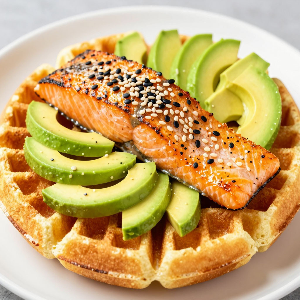- Разделить обжаренную форель на кусочки и выложить вместе с авокадо на готовую вафлю, сверху посыпать кунжутом.