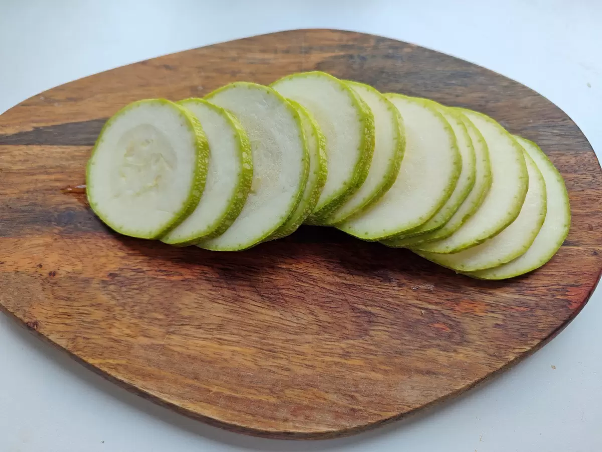 Начинать лучше с подготовки овощей. Кабачки нарезаются тонкими слайсами, толщиной не более 4 мм — это позволит им хорошо пропечься и сохранить форму. Противень смазывается маслом, после чего овощные слайсы выкладываются внахлест, чтобы создать красочный калейдоскоп на фоне.