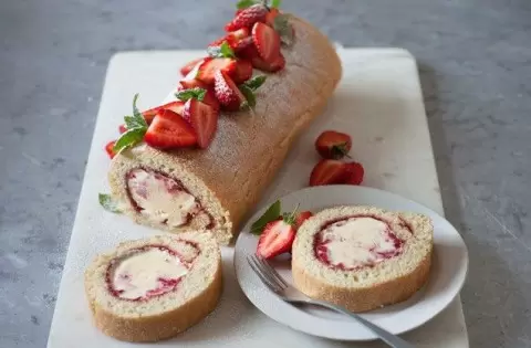 После выпекания корж немного остывает, после чего его аккуратно вытаскивают из формы. Горячий бисквіт нужно свернуть, при помощи бумаги, начиная с самой длинной стороны. Это поможет избежать трещин, и вы получите вытянутый цилиндр. Полностью остуженный корж разворачивают, обрезают подгоревшие края и намазывают 160 г клубничного джема с натертой цедрой лимона.