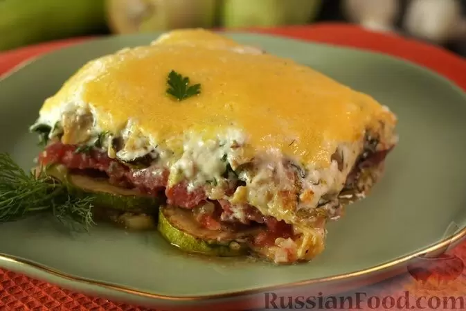 - Запеканка из кабачков с помидорами и беконом: Нежные кабачки, обжаренные шампиньоны и ароматный бекон – мощный коктейль вкусов, дополненный сливочным соусом.