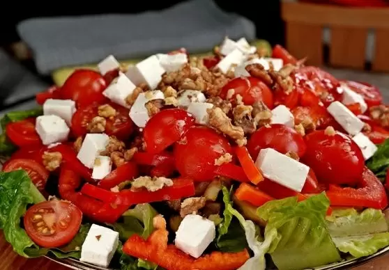 6. Затем равномерно распределяются помидоры и болгарский перец, завершающим штрихом становится выложенные кубики феты и измельчённые орехи. Салат поливают оставшейся заправкой и подают к столу.
