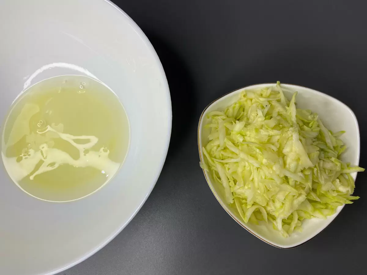 1. Начать стоит с отделения белков от желтков. Кабачки натираются на терке и хорошо отжимаются от лишней жидкости, после чего соединяются с белками.
