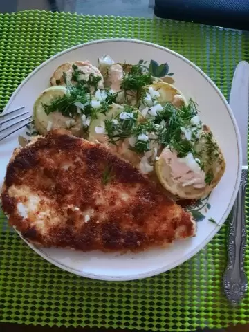 Ужин без углеводов — это легко и вкусно! В этот раз на столе будет куриный шницель и изысканные кабачки в сметанном соусе с чесноком и зеленью.