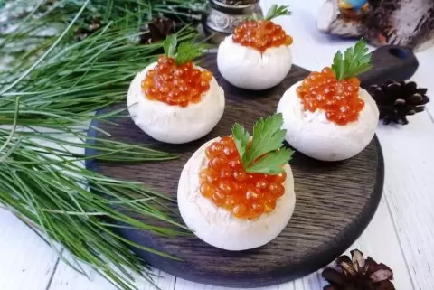 Эта закуска с красной икрой станет настоящей находкой для любого праздничного стола и подарит яркие впечатления всем гостям. Грибочки, которые используются в рецепте, тщательно отбираются — маленькие и аппетитные, идеально подходят для угощения. Необычно, но именно сырые шампиньоны идеально могут быть включены в наше меню — это один из немногих видов грибов, безопасных для употребления в сыром виде. Рекомендуется попробовать!