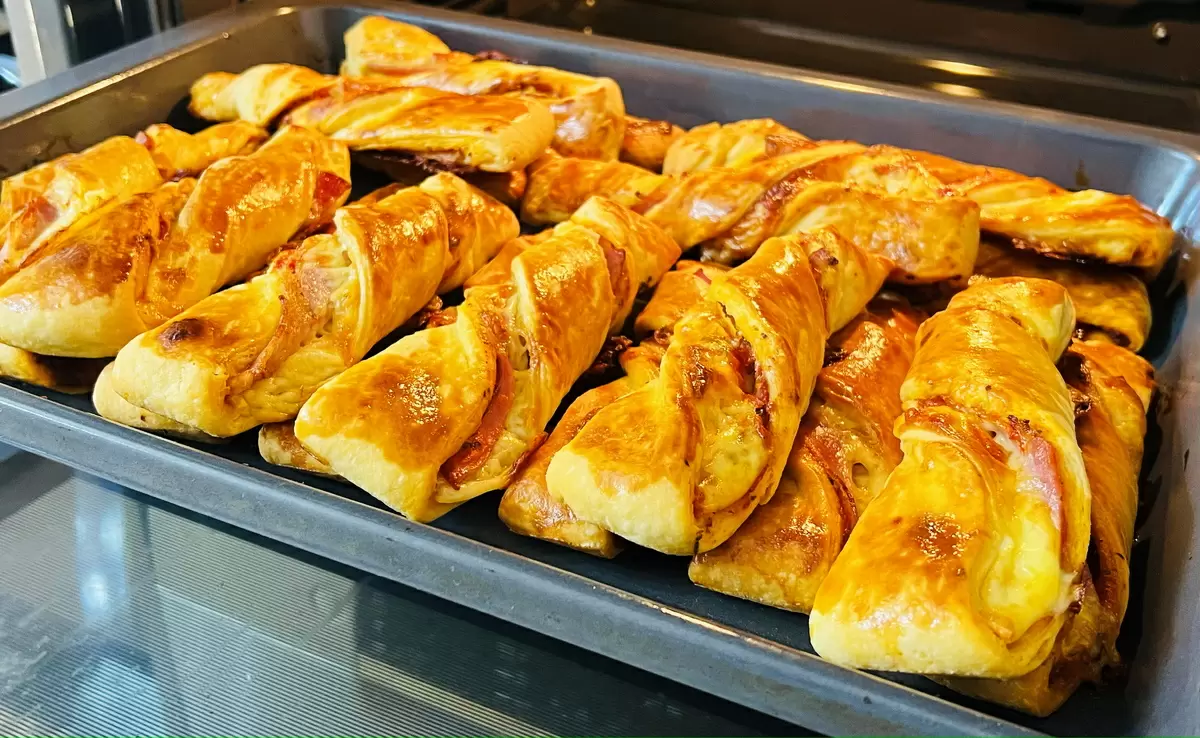Раскатав полученные заготовки, сформировать прямоугольный пласт и одной половину смазать томатным соусом, а на другую выложить мясную начинку и сыр. Сложить пополам и нарезать на полоски, каждую из которых завернуть, как веревочку. Выкладываются на предварительно смазанный противень и покрываются желтком.