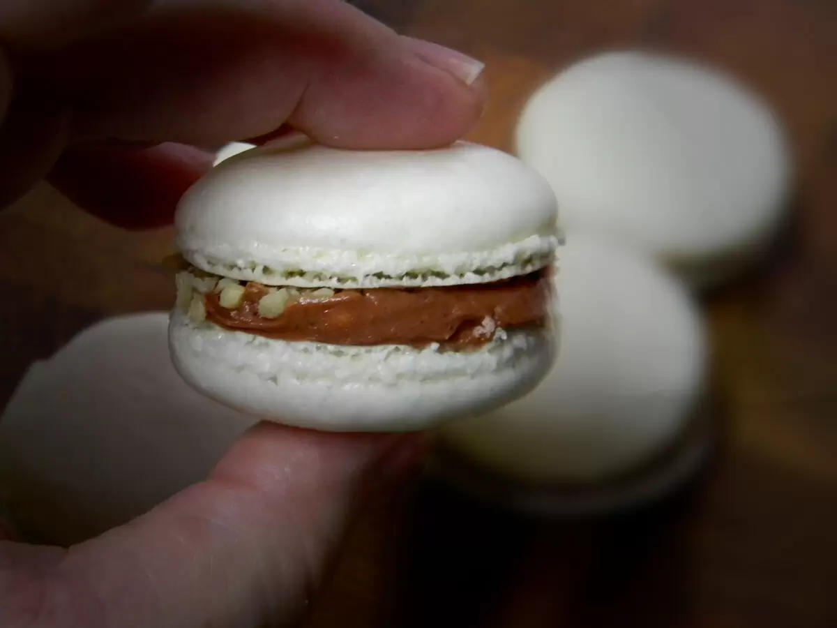 Для начинок не существует строгих правил. Используйте свою креативность! В данном случае подойдет классический ганаш из сливок и темного шоколада с добавлением дробленых грецких орехов. Такие макароны будут хрустящими снаружи и нежными внутри.