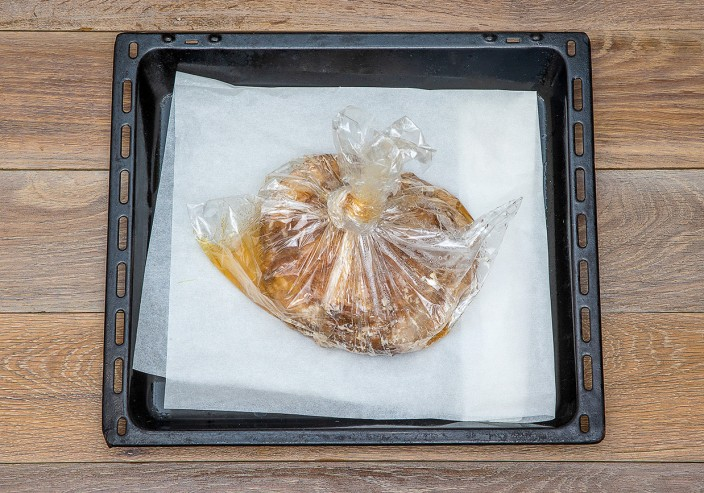 - Приготовление свинины: Разогрейте духовку до 130°C. Извлеките свинину из упаковки, промокните её, добавьте соль и разместите в пакет для запекания. Поставьте в духовку на 40 минут.